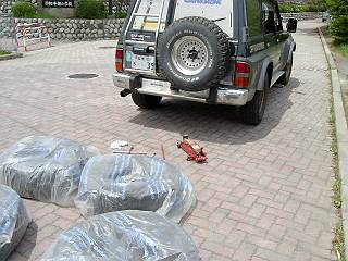 置き方もこのように、タイヤの位置関係がはっきりするように癖を付けてある。(もっとも、換える前のタイヤはどうおいても関係ないけど)