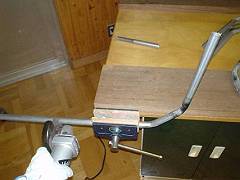 最初にパイプ(綿半ホームエイドで購入、3.3mで348円)を曲げる作業。熱しておいて熱いうちに曲げるが、金工用の万力などがないために外の壁と雨水管の間に挟み込んで曲げた。