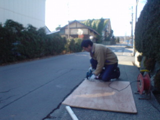 枠組み用合板(コンパネよりも耐水性に劣るが安い。3×6で670円)を使って上にのせる板を作る。段ボールで下作りをして大きさを合わせてから板に写して切断した。