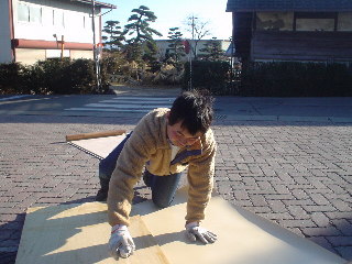 スプレーのボンドを使って、床用のパネルを貼り付けようとしているところ。