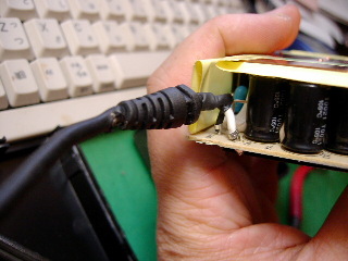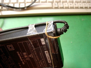 ブーツのすぐ後ろあたりが,被覆も破けて断線している。この部分のを切り落とした。今回は,ブーツの部分もケーブルから切りはずして,もう一度接着剤で切断してよい部分だけとなった電源ケーブルへ接続した。