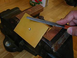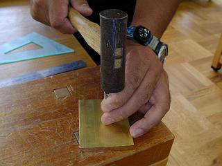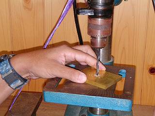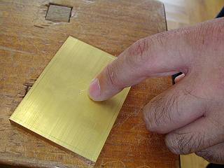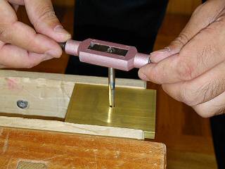 穴を開ける位置は対角線で中心にしようとしたが,けがき針の後が残るのもいやなので,両端をはかって中心を割り出した。ドリルが滑らないよう,センターポンチを打つ。