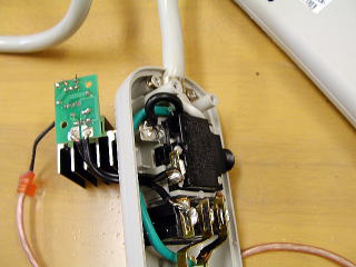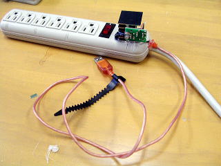 そこに,秋月電子で購入したSSR(基盤付きのキット)を使って作ったリレーをつけます。入力側にUSBのコネクタをつけて,パソコンに電源が入ると,USBに5Vがかかるのを使って,リレーをオンにします。ちなみにリレーのキットは350円 こちら