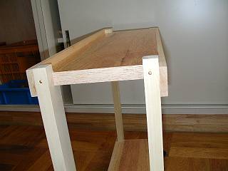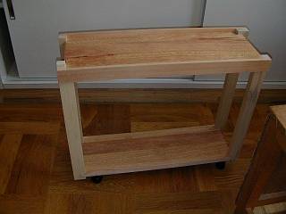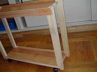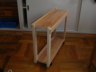 足は,のこぎり引きの練習をした後,天板を挟む相がき(片がき)の部分だけ,機械加工にしようと思っている。まく板となる部分は,外側からのうちつけで,縁を上に出して手すりのようにするか,面をあわせて大きなものを置けるようにするか。また,天板と足の接合部もいくつかバリエーションを選べるようにしてみた。足にはキャスターをつけて完成。自分の机の横に置いて使っている。