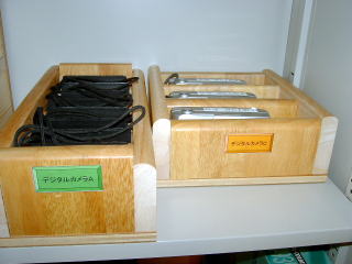デジタルカメラが増えてきたが,小さいものだけに,ついバラバラしてしまう。 それぞれの大きさに合わせて,枠をつくって棚に入れることにした。