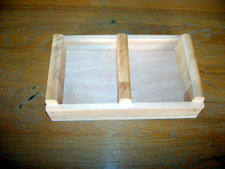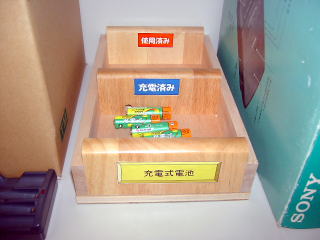 カメラの電池はすべて単3型にそろえてあるが,大勢が使うので管理は大変。 終わったら,使用済みの枠に入れるように入れ物をつくった。