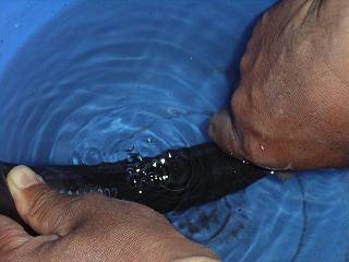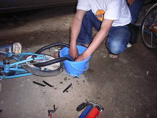 空気を入れてすぐに抜けきることがないスローパンクチャーだったので、バケツを取り出してきて水につけた。