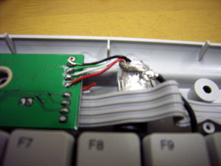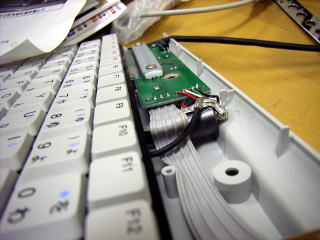 実際のケーブルは帯状のケーブルの下を通ってキーボードの下へ入り込んでいる。