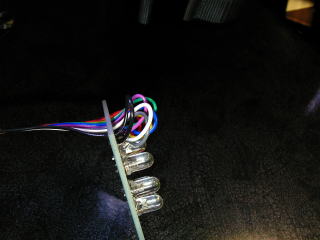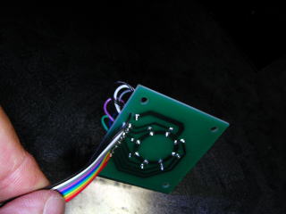 これはLED基盤との接続部。裏からコードを差し込んでもう一度挿し直してハンダ付けをするが、ハンダ付けの際にはこれくらいコードを長く入れておかないと、熱で被覆が切れてしまう。ハンダ付けが終わったら引っ張ってぎりぎりまでコードを戻す。