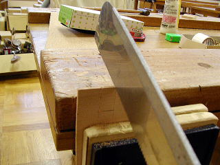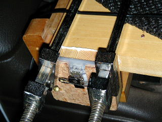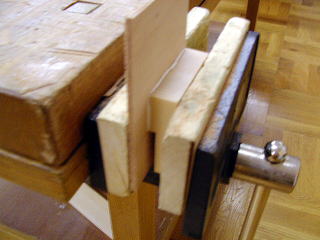 テーブルに取り付けて、ハタガネで締め付けているところ。木工ボンドのみで取り付けた。