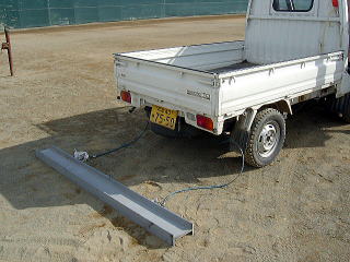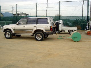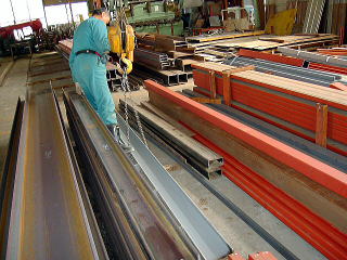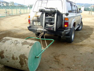 表面をならしてからローラーをかけようと言うことになり、最初はトンボを車でひこうかという話をしていたが、やはり重い鉄骨でもひかなきゃだめだろうということになり、知り合いの鉄工所へおじゃましてH鋼を切ってもらってきた。
