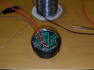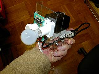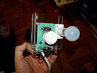 センサーの隣にランプを付け、下の部分をネジで留めて一緒に角度を調整できるようにした。ランプは直接接続せず、プラグを介してリレーからの出力につなぐ。必要に応じて他の電気機器をつなぐことができるようにした。このリレーは200wまで使えるので、3つ口コンセントなどを入れてもいいかな。