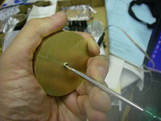 まず、M6のネジに対して、3mmのドリルで穴をあけてみる。その後、糸鋸で切れ目を入れる。