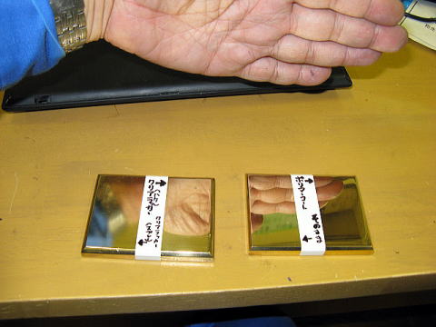真鍮盤をピカールで磨いた状態。ここまできれいに映れば生徒のモチベーションも上がろうというもの。