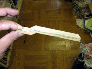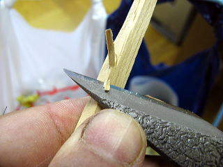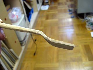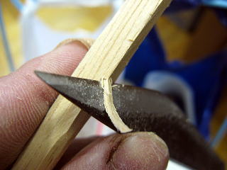 そこから小刀で削っていく。左側は逆目になっているので良くない。右側が正しい。