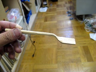 今回つくったのはバターナイフ。ペーパーカッターなどだと生徒は使わないし、スプーンは中を掘らなければいけないのでこれにしてみた。
