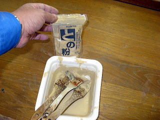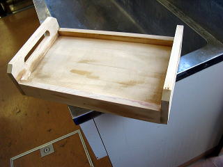 授業では使わなかったけれど、とのこを使ってみた。 とのこと今回のオスモワックスの相性はどうなのかな。 とのこが乾いたところで、塗装開始。マホガニーを選んだ。 塗装終了。授業でも実演してみたけれど、水道で水をかけてもしっかりはじくので、お盆としてもちゃんと使えると思う。 学校で自分用に使うことにした。