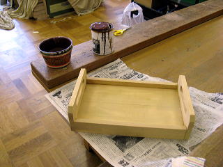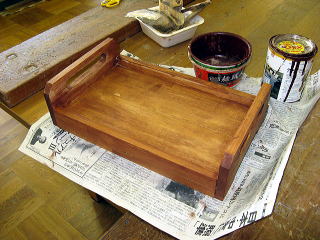 1年生の授業も全て終了し、全員の塗装を終えることができた。 自分がサンプルに作ったお盆を塗装してみた。