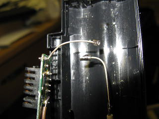 バッテリーの側面、脚になっている部分に穴をあけて線を引き込む。