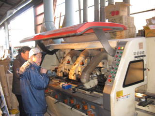今回初めて知った機械。「モルダー」。これは6軸モルダー,一度に6種の刃で一度材を通すといっぺんに加工されて出てくる。4面プレーナの刃を平らだけでなく各種彫り込み等のできる刃に替えた物といえる。