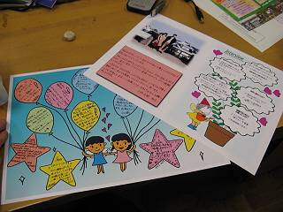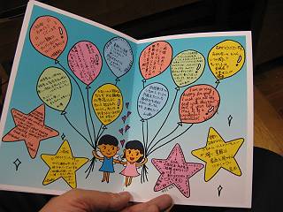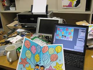 メッセージとイラストは手書きで書いてもらって、スキャナで取り込み、フォトショップで合成。