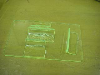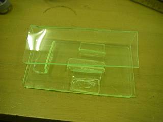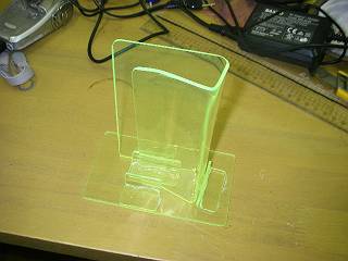 アクリル曲げ器で曲げて、はさんで立てるようにしたが、不安定なので台も作った。