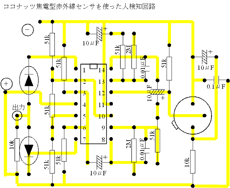 先日、ココナッツ用の焦電型センサを使ったプロトタイプ基盤を作ったが、量産するためには基盤のパターンを起こさなければいけないので考えてみた。