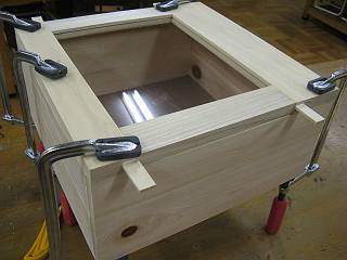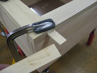 また、今回は、アクリル板の溝を深くしたので、丸鋸でひいた部分を横に出したため、木で埋めることにした。 この後、塗装と金具付けをして、シールを貼れば完成。