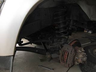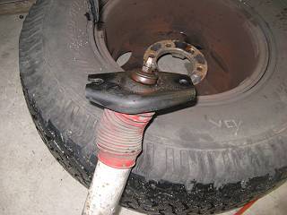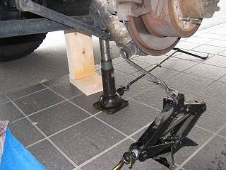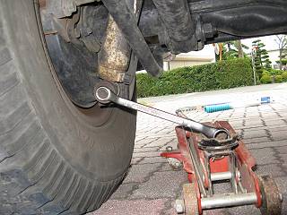 後ろはボルトを手で回してもびくともしないので、ジャッキでレンチを持ち上げてゆるめる。
