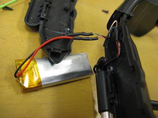 右側に基盤が入っている。一番右にUSBコネクタ。 左側はバッテリー。 ちょっと接続コードにひげが出ていて、ショートしているっぽかったので、それをほどいて組み立てたら復活した。 ついでに、隙間テープを貼って鼻で留まるようにしてみた。