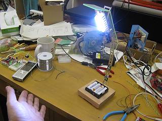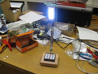 本日学校でやったもう一つの加工。昨年度教育センターで発表した際に、テクノキットの社長さんからいただいた16個LEDを使った明るいライト基盤をスタンドにした。