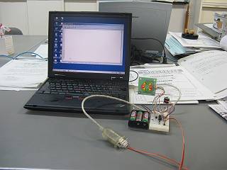 通信ケーブルは、10本の平線を3つずつにさいて使う。右の写真ではUSB変換アダプタを使って接続している。