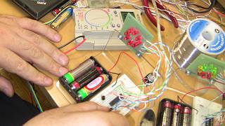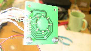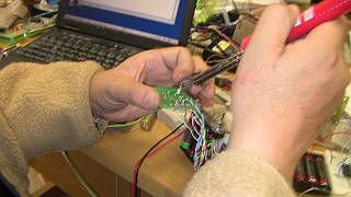 ランドがはがれてしまった基盤をハンダ付けしている図。とぼけて入力をアースにつないでしまったりなんかして・・・
