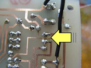 できあがったものの、動作はしなかった。いろいろ探してみたところ、上の写真矢印の部分でパターンが切れていた。