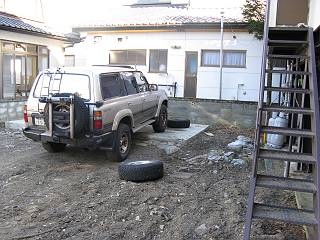 以前小屋があった部分のコンクリート基礎を残してもらってあったので、そこへ載せてジャッキを使った。