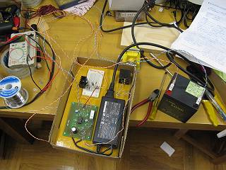 充電中の様子。ヒートシンクとACアダプタもそこそこ発電するが、定電流回路で押さえてあるため大丈夫な感じ。