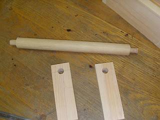 取っ手も作ることにした。100円ショップで買った36mmの丸棒の両サイドを旋盤で15mmに削り、通しほぞにした。
