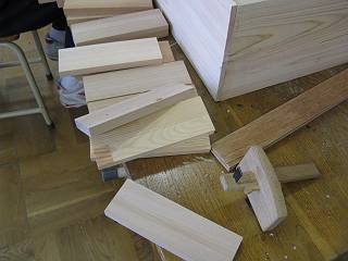 今回は檜材を使って作ってみた。6台のテーブルで12個の万力がリニューアルできた。