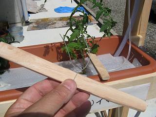 水の上下により、苗が転んでしまうので支えをつけてみた。
