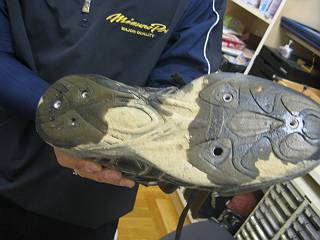 手にしているのは、ピンのすり減った古い野球のスパイク。
