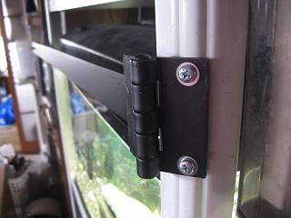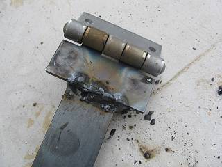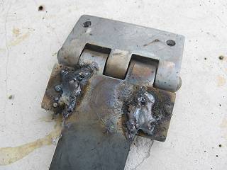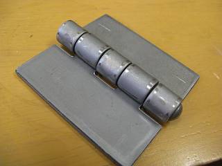 ヒンジは片側にスチール棚の柱にあわせて穴を開けてからスチールベルトに溶接する。