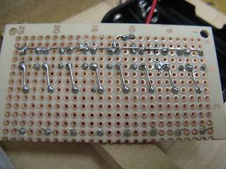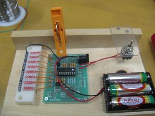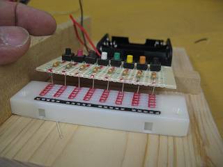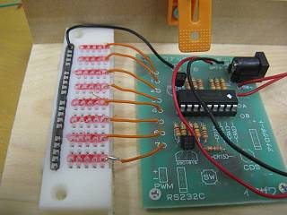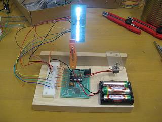 基板を支える洗濯ばさみもつけてみた。プログラムは、最初全点灯の後、一つずつ確認しながら点灯させるものとした。