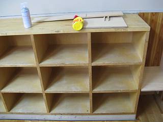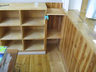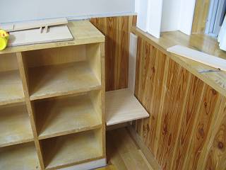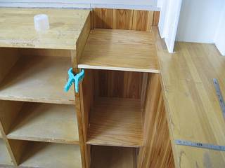 昨年の授業でのあまり材で両側に柱を入れて棚の溝をつけた。