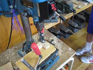 ペン立て部分は早く終わった生徒にボール盤どんどん穴あけをしてもらう。こちらは12mmのドリル。
