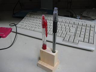 机用のペンスタンド。2つの穴に2本刺すことができ,真ん中は下から釘を打って固定するため逃がしてある。