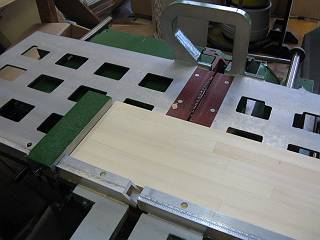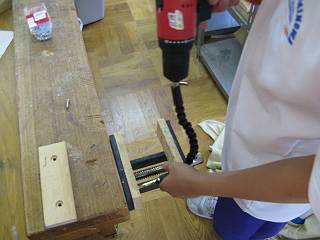 穴あけは2段ギリで開ける。先日の木工授業で使った治具を使って位置決めをした。