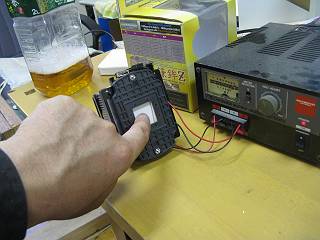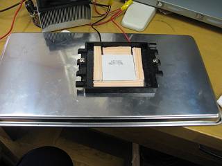 ペルチェとクーラーをくっつけて電源につないでみる。11Vで5A流れて、この電源ではめいっぱいの状態。