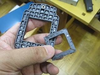 下側も削って平らにしたあと、糸鋸で枠を切り取る。