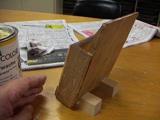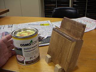 トリマで焦がしてしまったので、オスモの濃い色で塗装をする。ボンドがとんでいて塗装が乗らないところがあったりして、御粗末。