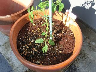 先日はプランターにしたトマトを植木鉢にも植えて比較するのと、緑のカーテンを試してみるためのゴーヤを植えた。